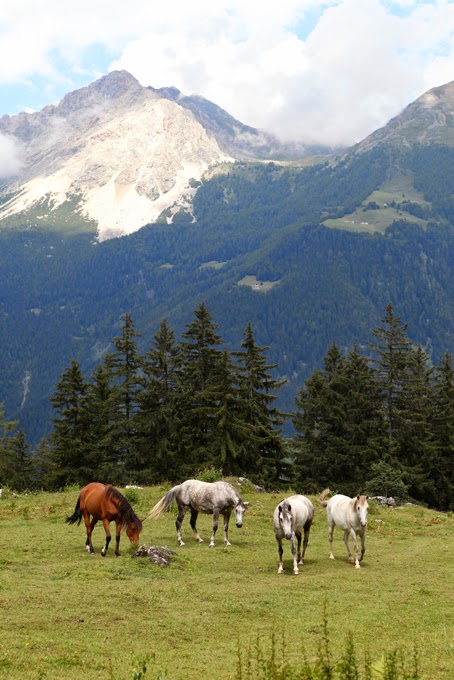 Die Stuten bilden während der Abfohlzeit eine eigene Gruppe. Das Abfohlen findet in einem getrennten Bereich aber mit Sicht- und Hörkontakt zu den anderen Stuten statt. Wir sind bei der Geburt immer dabei, halten uns aber im Hintergrund, wenn kein Eingreifen erforderlich ist. So können die Stuten ungestört ihre Beziehung zum Fohlen aufbauen. Die ersten Wochen verbringen die Mütter mit ihren Kindern auf dem Hof und auf den umliegenden Weiden. In dieser Zeit lernen sie unsere Familienmitglieder kennen und wir haben die Möglichkeit, die Kleinen zu beobachten und uns an ihnen zu freuen. Im Sommer kommt die Müttergruppe dann auf eine nahegelegene Bergweide. Dort geniessen sie viel Freiheit, können nach Herzenslust spielen und werden mit abwechslungsreichem Gelände konfrontiert. Das macht sie tritt- und selbstsicher. Im Herbst folgt dann die Integration in die grosse Herde. Ab dann kommen die Fohlen bei der Morgen- und Abfütterung mit einer Mutterstute in einen separaten Fressbereich. Sie sind somit regelmässig für eine Weile von den Müttern getrennt, aber nicht ganz unter sich, weil ja eine Mamma mit dabei ist. Abgesetzt werden die Fohlen mit frühestens neun Monaten, falls die Stute nicht wieder trächtig ist, warten wir bis zu einem Jahr. Beim Absetzen wird die Mutter zuerst stundenweise, dann tagesweise und zuletzt konstant aus der grossen Herde entfernt. Für das Fohlen bleibt so alles andere gleich: der Ort, die Gruppe, der Tagesablauf, die Spielfreunde. Die Kleinen kommen auf diese Weise problemlos mit der Trennung zurecht und sind als Jährlinge bereit für ihren ersten richtigen Alpaufenthalt auf 2000 m.ü.M.