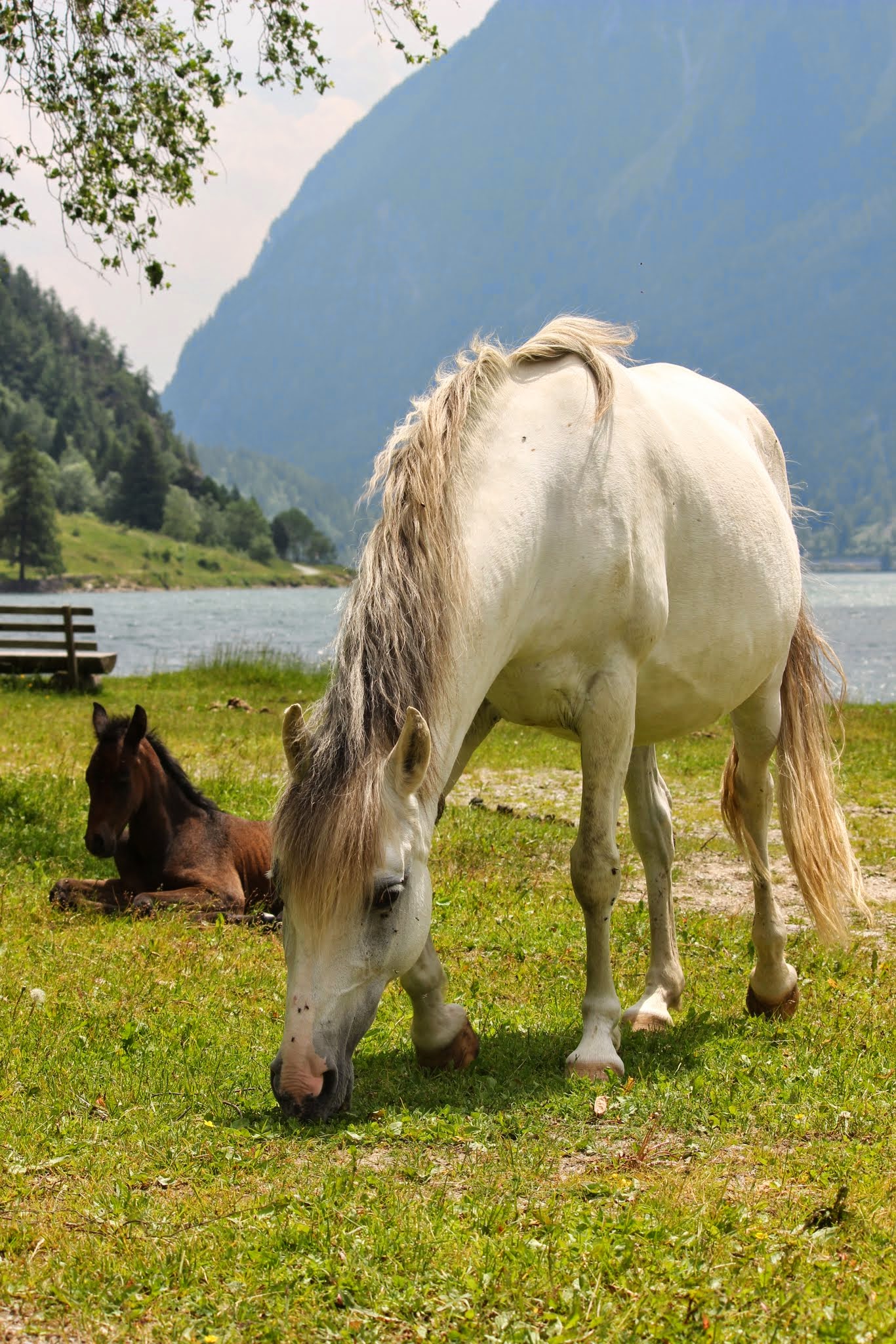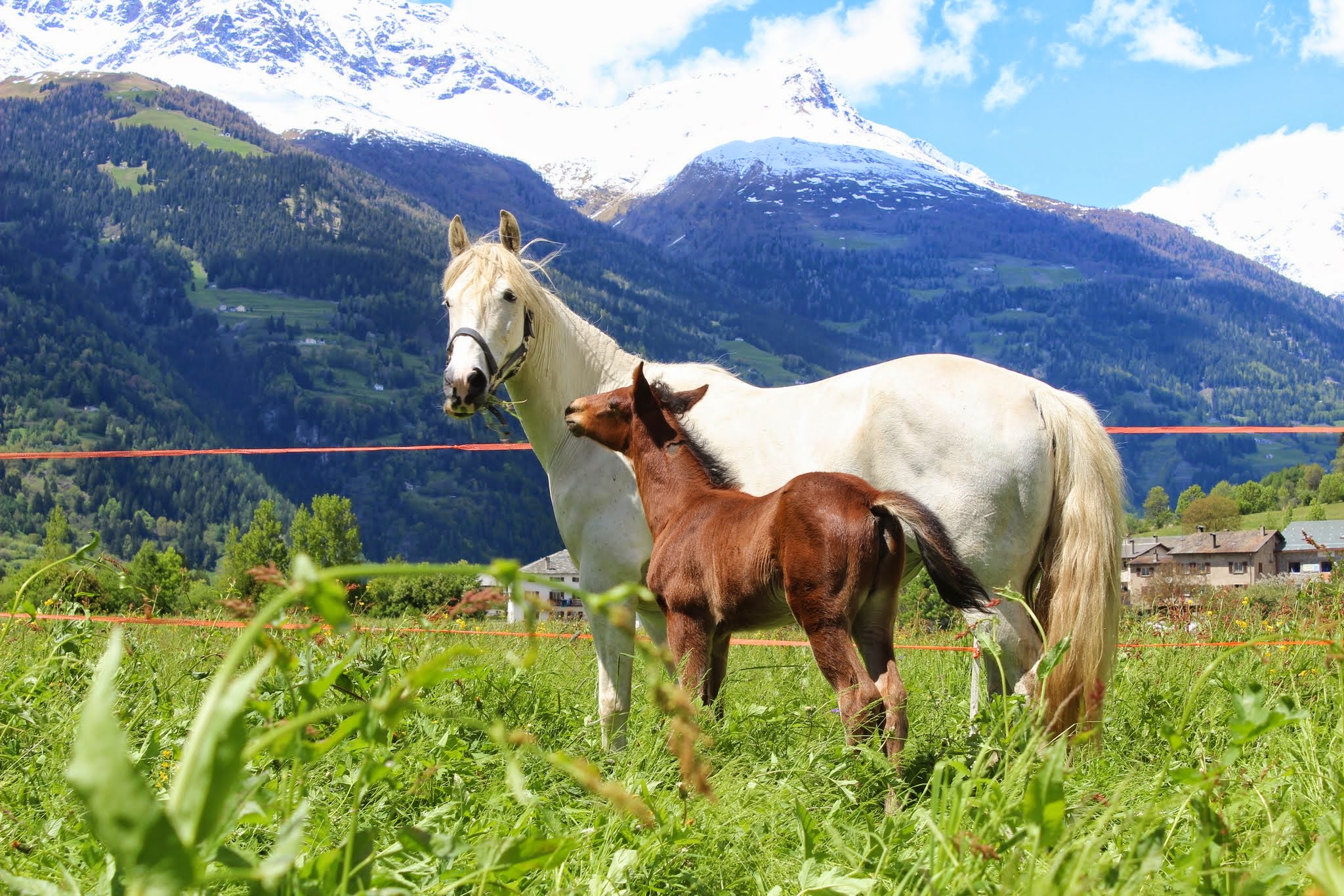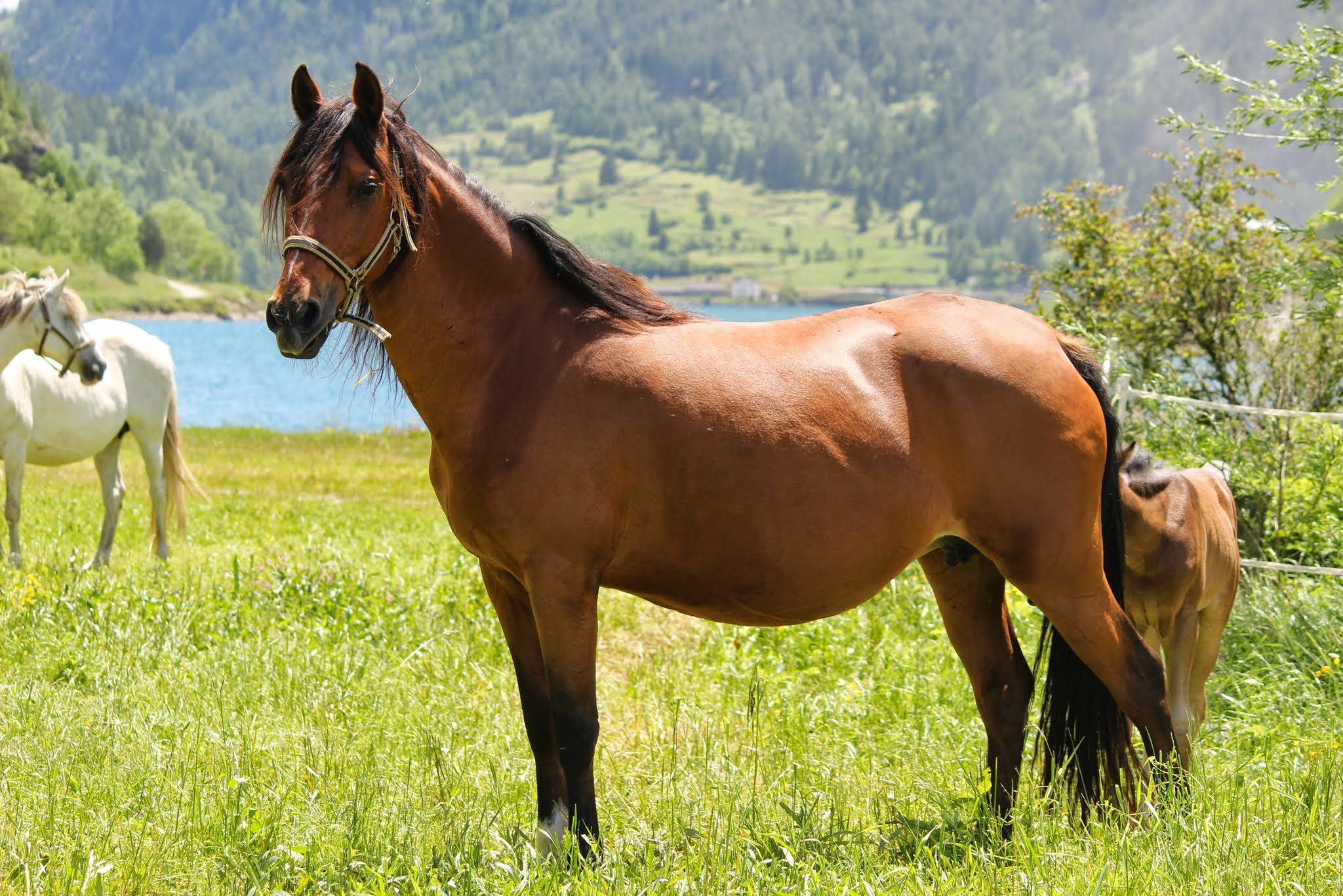 Die Stuten bilden während der Abfohlzeit eine eigene Gruppe. Das Abfohlen findet in einem getrennten Bereich aber mit Sicht- und Hörkontakt zu den anderen Stuten statt. Wir sind bei der Geburt immer dabei, halten uns aber im Hintergrund, wenn kein Eingreifen erforderlich ist. So können die Stuten ungestört ihre Beziehung zum Fohlen aufbauen. Die ersten Wochen verbringen die Mütter mit ihren Kindern auf dem Hof und auf den umliegenden Weiden. In dieser Zeit lernen sie unsere Familienmitglieder kennen und wir haben die Möglichkeit, die Kleinen zu beobachten und uns an ihnen zu freuen. Im Sommer kommt die Müttergruppe dann auf eine nahegelegene Bergweide. Dort geniessen sie viel Freiheit, können nach Herzenslust spielen und werden mit abwechslungsreichem Gelände konfrontiert. Das macht sie tritt- und selbstsicher. Im Herbst folgt dann die Integration in die grosse Herde. Ab dann kommen die Fohlen bei der Morgen- und Abfütterung mit einer Mutterstute in einen separaten Fressbereich. Sie sind somit regelmässig für eine Weile von den Müttern getrennt, aber nicht ganz unter sich, weil ja eine Mamma mit dabei ist. Abgesetzt werden die Fohlen mit frühestens neun Monaten, falls die Stute nicht wieder trächtig ist, warten wir bis zu einem Jahr. Beim Absetzen wird die Mutter zuerst stundenweise, dann tagesweise und zuletzt konstant aus der grossen Herde entfernt. Für das Fohlen bleibt so alles andere gleich: der Ort, die Gruppe, der Tagesablauf, die Spielfreunde. Die Kleinen kommen auf diese Weise problemlos mit der Trennung zurecht und sind als Jährlinge bereit für ihren ersten richtigen Alpaufenthalt auf 2000 m.ü.M.