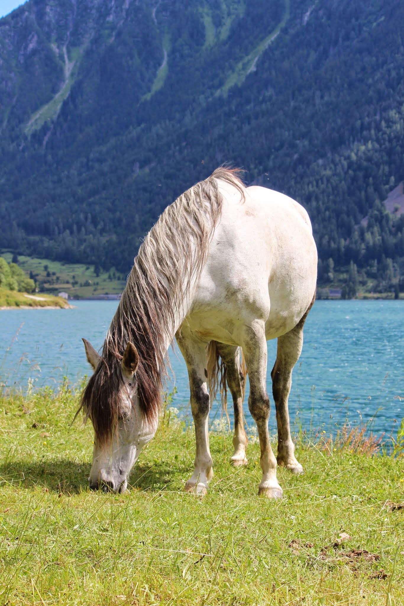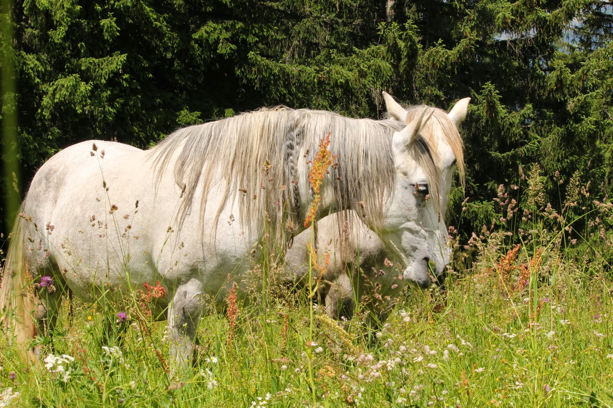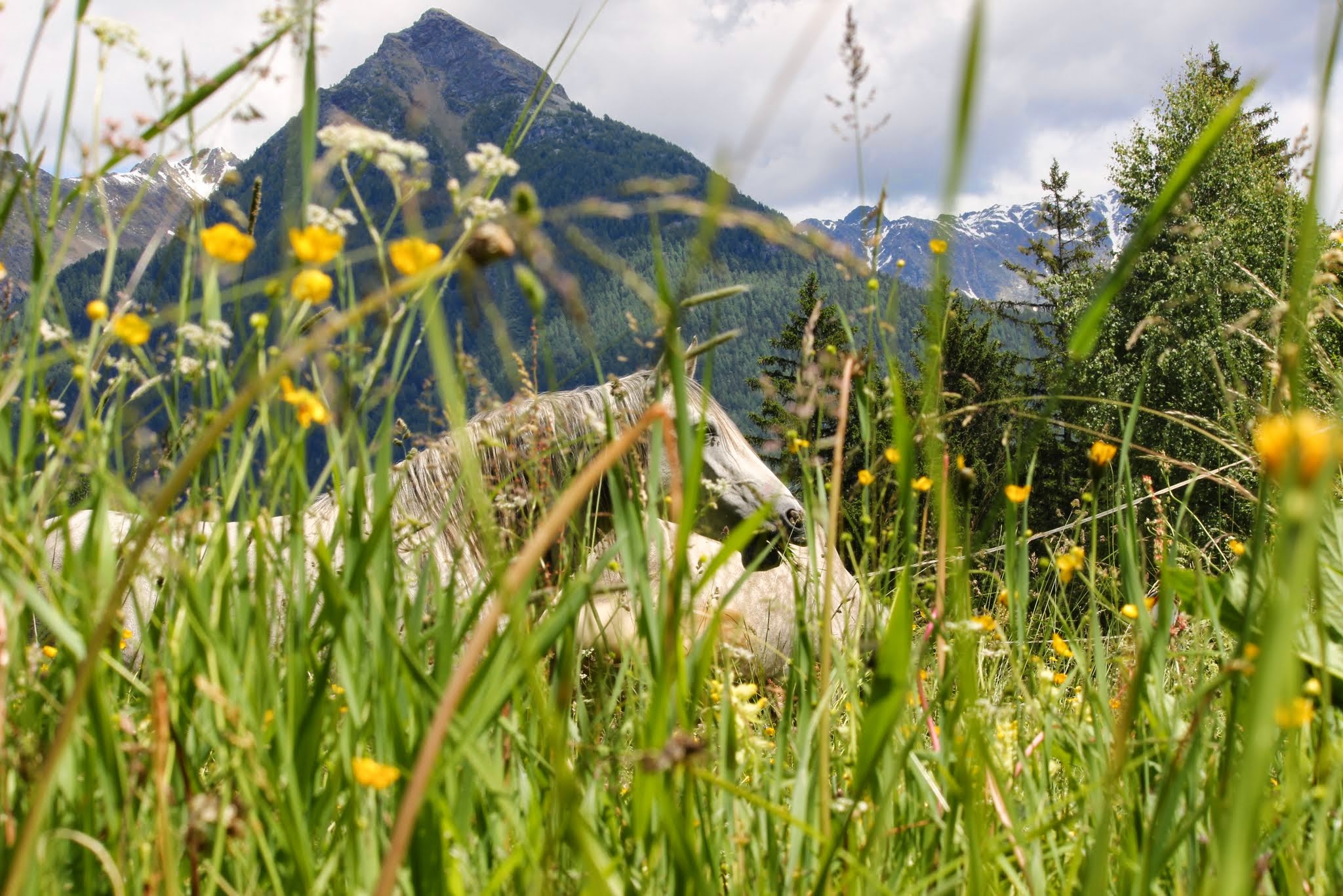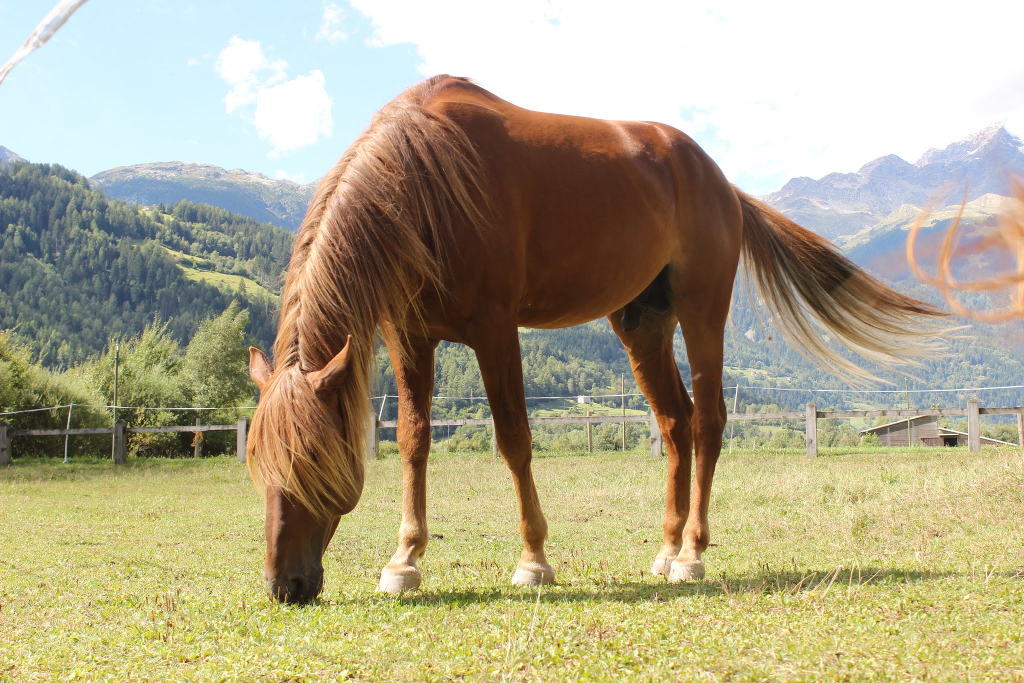 Die Stuten bilden während der Abfohlzeit eine eigene Gruppe. Das Abfohlen findet in einem getrennten Bereich aber mit Sicht- und Hörkontakt zu den anderen Stuten statt. Wir sind bei der Geburt immer dabei, halten uns aber im Hintergrund, wenn kein Eingreifen erforderlich ist. So können die Stuten ungestört ihre Beziehung zum Fohlen aufbauen. Die ersten Wochen verbringen die Mütter mit ihren Kindern auf dem Hof und auf den umliegenden Weiden. In dieser Zeit lernen sie unsere Familienmitglieder kennen und wir haben die Möglichkeit, die Kleinen zu beobachten und uns an ihnen zu freuen. Im Sommer kommt die Müttergruppe dann auf eine nahegelegene Bergweide. Dort geniessen sie viel Freiheit, können nach Herzenslust spielen und werden mit abwechslungsreichem Gelände konfrontiert. Das macht sie tritt- und selbstsicher. Im Herbst folgt dann die Integration in die grosse Herde. Ab dann kommen die Fohlen bei der Morgen- und Abfütterung mit einer Mutterstute in einen separaten Fressbereich. Sie sind somit regelmässig für eine Weile von den Müttern getrennt, aber nicht ganz unter sich, weil ja eine Mamma mit dabei ist. Abgesetzt werden die Fohlen mit frühestens neun Monaten, falls die Stute nicht wieder trächtig ist, warten wir bis zu einem Jahr. Beim Absetzen wird die Mutter zuerst stundenweise, dann tagesweise und zuletzt konstant aus der grossen Herde entfernt. Für das Fohlen bleibt so alles andere gleich: der Ort, die Gruppe, der Tagesablauf, die Spielfreunde. Die Kleinen kommen auf diese Weise problemlos mit der Trennung zurecht und sind als Jährlinge bereit für ihren ersten richtigen Alpaufenthalt auf 2000 m.ü.M.